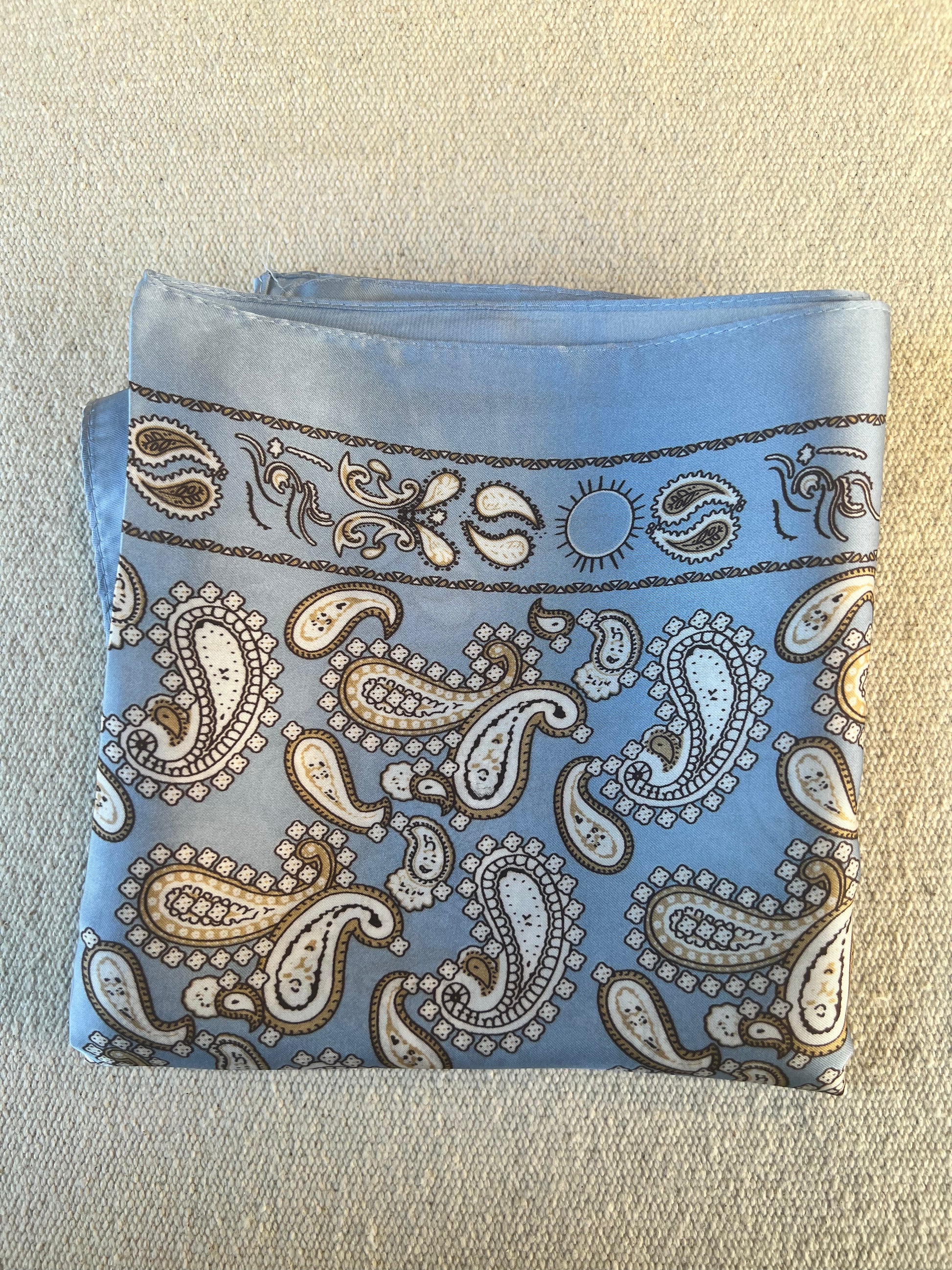 Pañuelo cuadrado con es estampados en fondo de color azul claro, satinado
